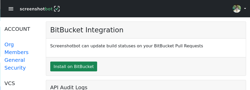 To give Screenshotbot access to your BitBucket, just go to the BitBucket option in the Settings page, and click the big green Install on BitBucket button